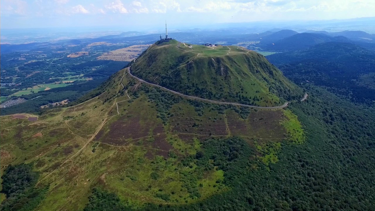山地の火山群とリマーニュ断層からなる逆転地形がみられる場所。