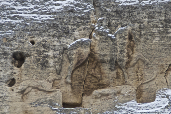 100mの断崖にあり、高さ23mの位置に縦2.5m、横3mにわたり彫られている。